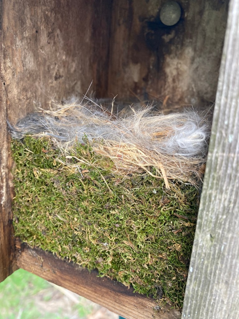 However, this evening when I checked the nest, I knocked on the side of the box, and out flew a Carolina Chickadee! Turns out their nests also fit the moss/fur description.